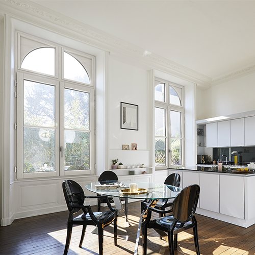 Dans cette cuisine lumineuse nous retrouvons 2 fenêtres 2 vantaux sur mesure, surmontées d’impostes plein cintre mouchoir. Un simple petit-bois en applique horizontal apporte avec élégance la touche finale à cette pièce.
