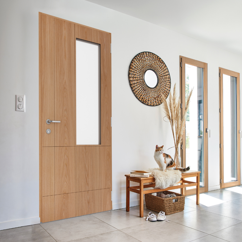 La porte d’entrée Énigme apporte une touche d’élégance naturelle à votre intérieur grâce à son design épuré et ses lignes verticales discrètement soulignées. Son grand vitrage dépoli laisse passer la lumière tout en préservant votre intimité, créant ainsi une atmosphère chaleureuse et accueillante. Avec son esthétique moderne, elle s’intègre harmonieusement à tous les styles d’aménagement. Disponible dans 13 finitions bois pour l’intérieur et 27 couleurs pour l’extérieur, la porte Énigme se personnalise selon vos envies pour devenir un véritable élément décoratif de votre habitation.