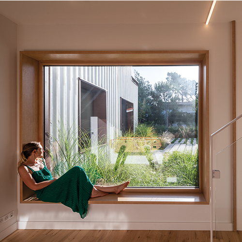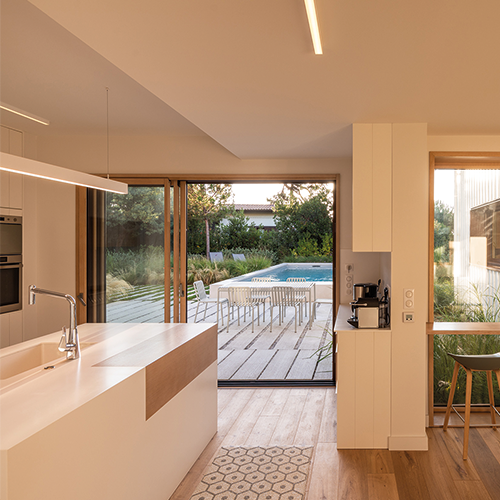 Cette maison implantée dans le Bassin d’Arcachon sur les hauteurs d’un village ostréicole est constituée de 3 volumes reliés entre eux. Véritable colonne vertébrale du projet, la transversale intérieure permet de lier les volumes. Les différentes hauteurs sous plafond viennent marquer les différents espaces de vie et offrent des volumes très ouverts. De grandes baies coulissantes et châssis vitrés MéO font le lien entre l’intérieur et l’extérieur de cette maison baignée de lumière.