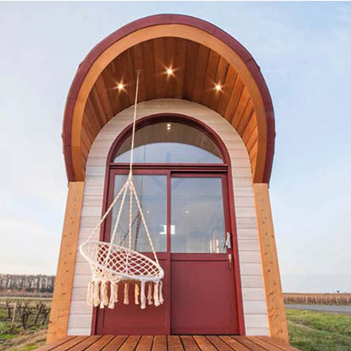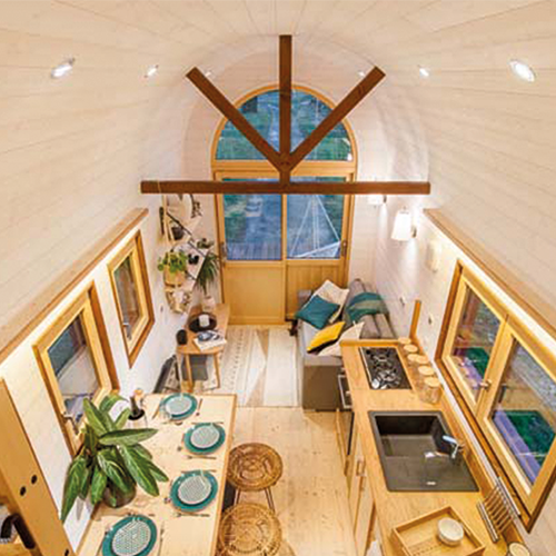 Nous nous sommes donc inspirés de la forme traditionnelle des roulottes pour concevoir une tiny house à la charpente arrondie qui lui donne tant de charme. Les chevrons cintrés de la charpente ont été fabriqués par notre équipe dans les ateliers Baluchon. Une imposte plein cintre au-dessus de la porte d’entrée coulissante vient souligner le concept de cette architecture qui a été un vrai challenge technique.