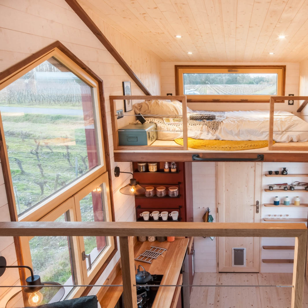 Le revêtement de la toiture est en aluminium, plus durable et léger que l’acier et pour plus d’harmonie nous faisons toujours le choix d’assortir la couleur du toit aux menuiseries. Les menuiseries ont une place très importante dans les tiny houses. Elles apportent de la lumière et agrandissent l’espace en permettant de se projeter vers l’extérieur. Elles sont un trait d’union dans ce mode de vie très proche de la nature.