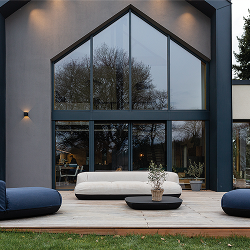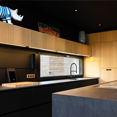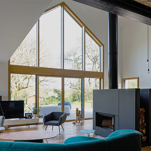 Cette maison individuelle est équipée pour toutes ses ouvertures de menuiseries bois-aluminium MéO. Elles offrent une belle luminosité au quotidien, notamment, avec le mur rideau qui apporte également une superbe hauteur sous plafond. Pour se protéger du froid en hiver, des volets roulants ont été installés.