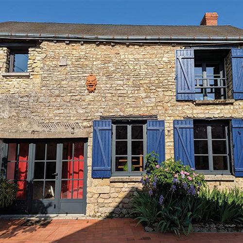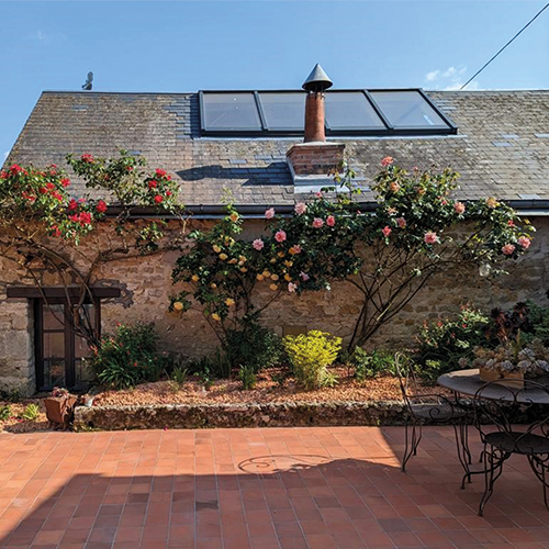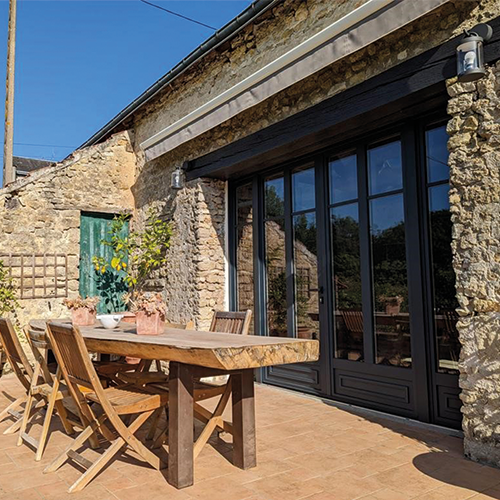 Les propriétaires de cette charmante maison ont intégralement rénové les menuiseries, notamment la verrière de toit et l’ensemble composé en façade (porte-fenêtre avec châssis fixes et soubassement accompagnés de petits bois en applique). Ils désiraient avant tout apporter de la luminosité dans cet ancien corps de ferme.