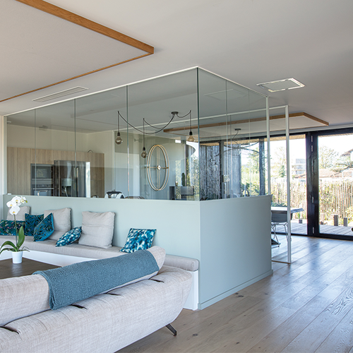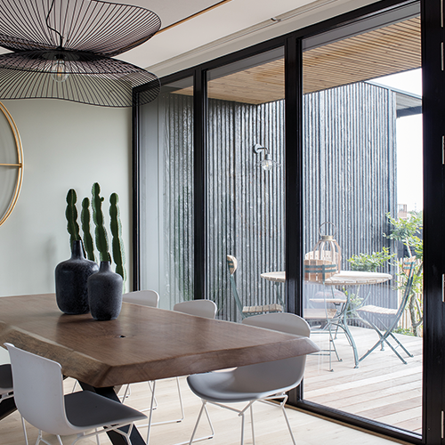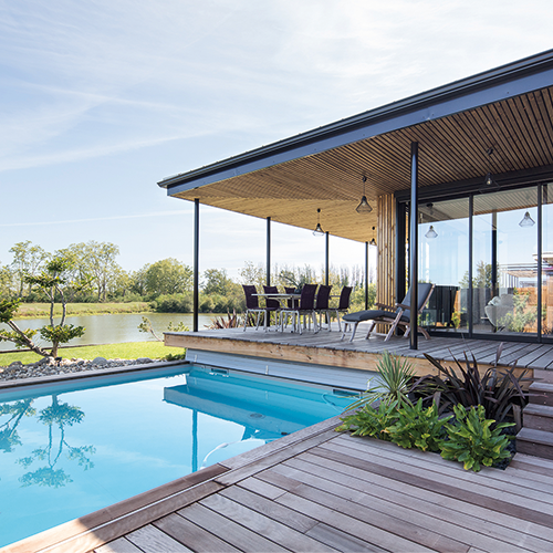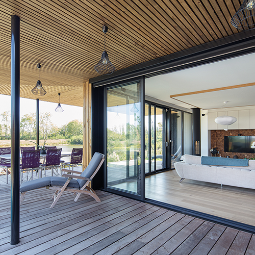 La toiture arrondie est en bac acier cintré. La maison est très lumineuse, toujours ouverte sur le lac et son jardin japonais zen. Les grandes baies coulissantes MéO finition pin blanc côté intérieur ont été repeintes couleur ardoise pour personnaliser la déco. On retrouve à l’extérieur une couleur aluminium 9005 T. Les baies coulissantes sont protégées des apports directs du soleil par une grande terrasse couverte donnant directement sur la piscine. Enfin, des BSO ont été installées sur certaines menuiseries afin de contrôler les apports solaires.